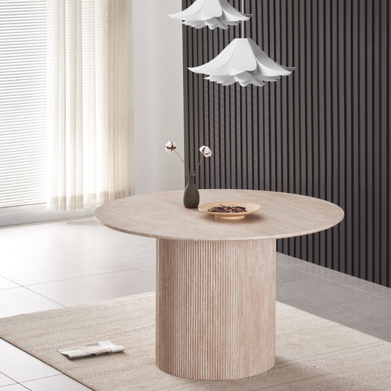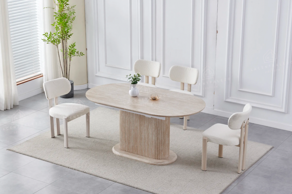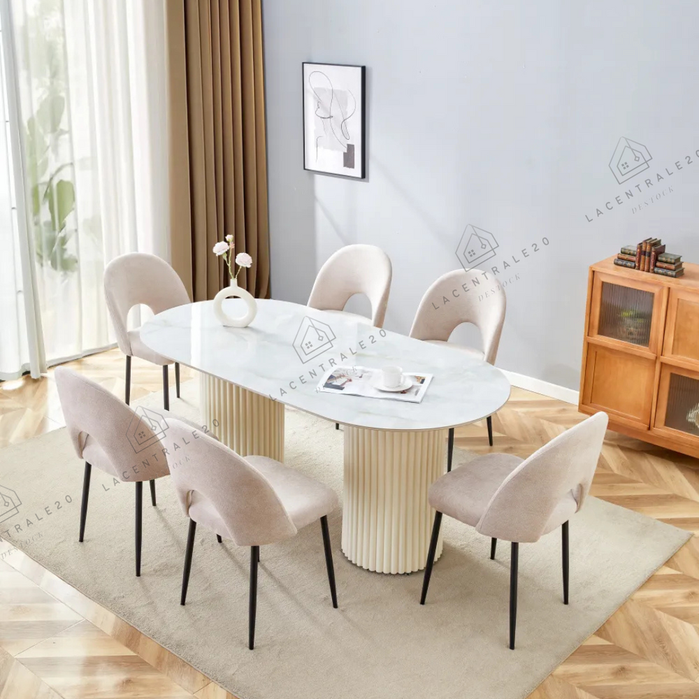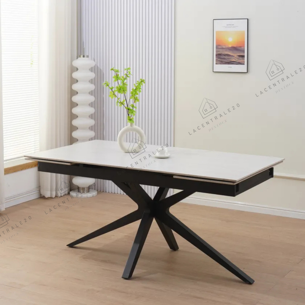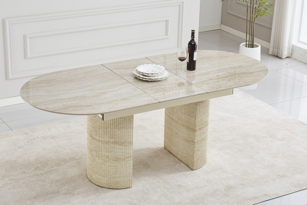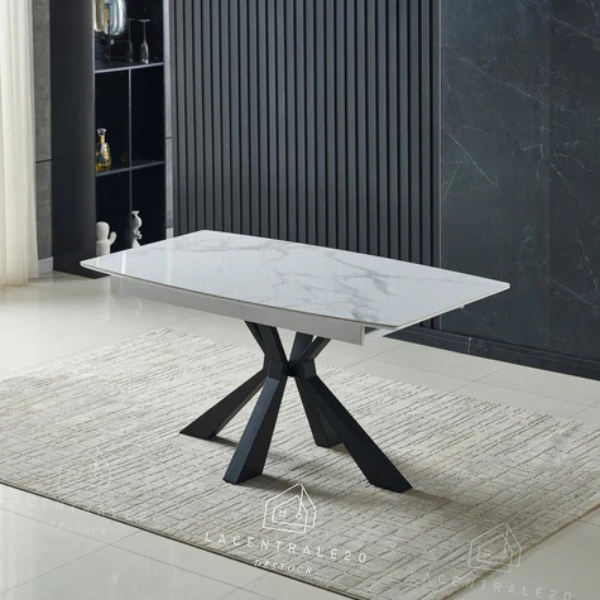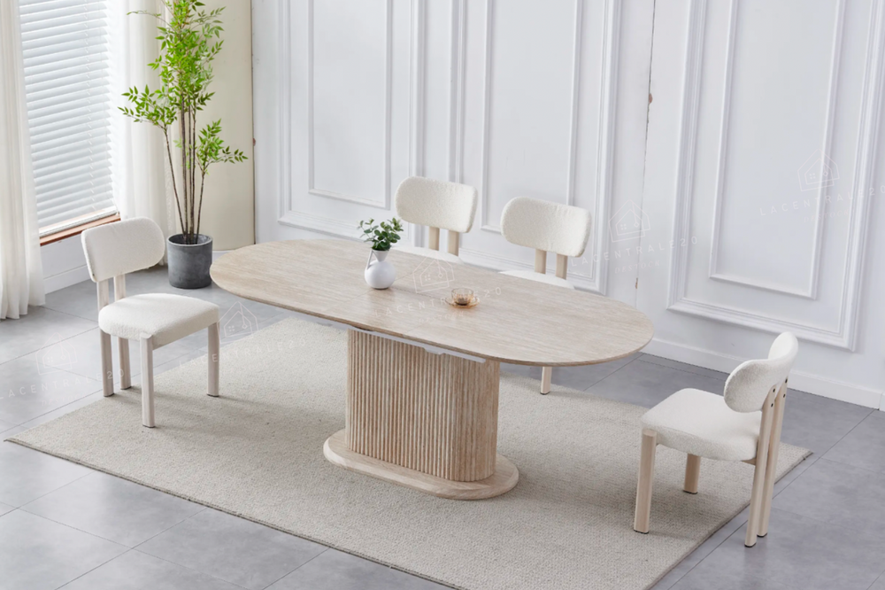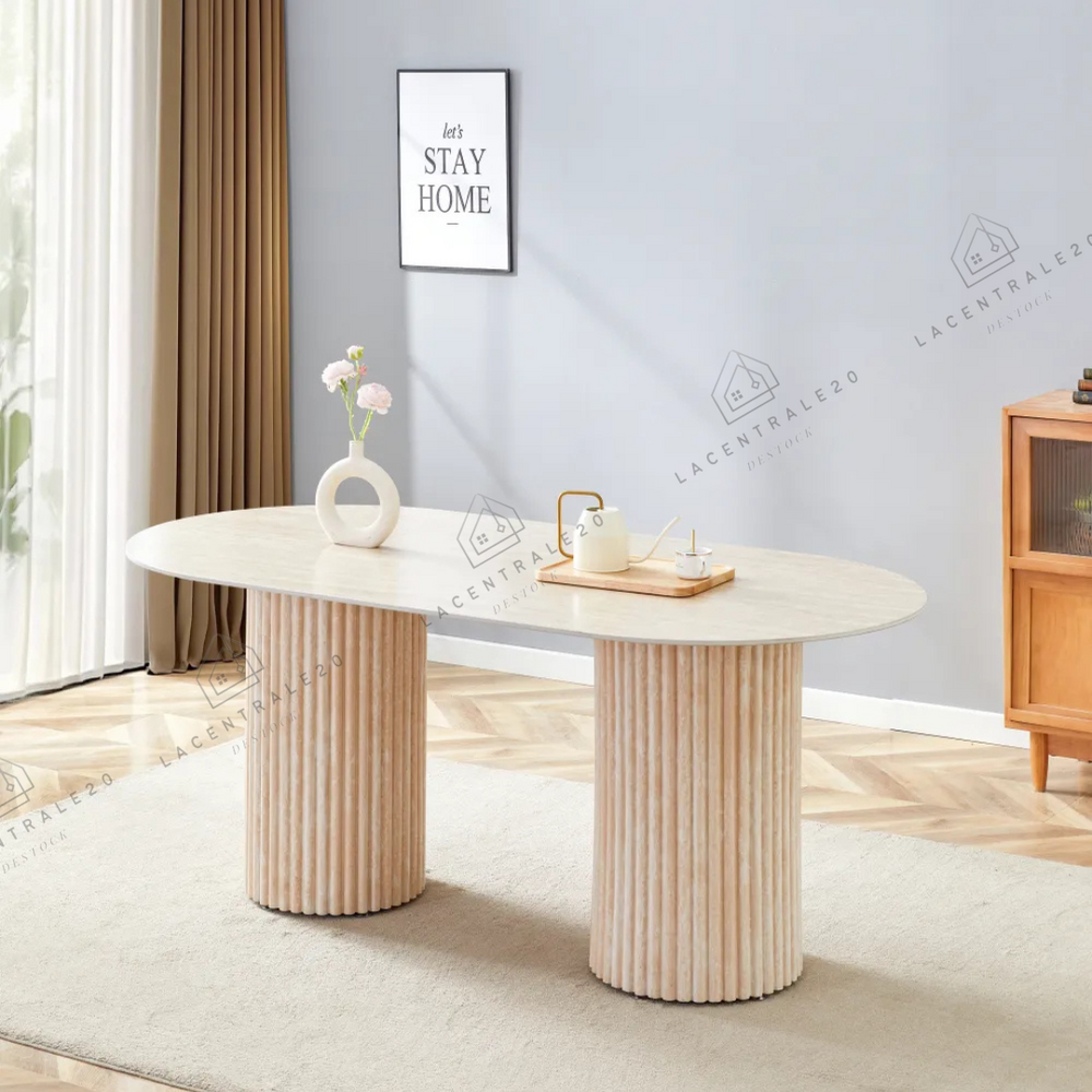 La table Sahara allie design travertin et fonctionnalité. Compacte au quotidien, généreuse quand vous recevez.
