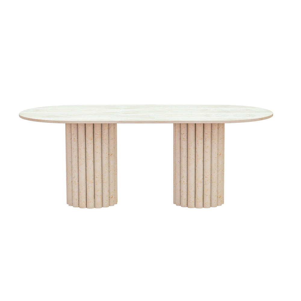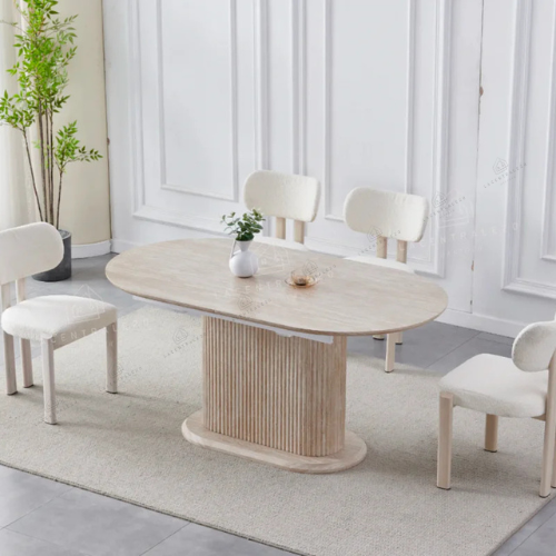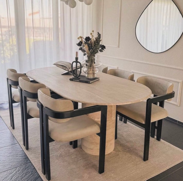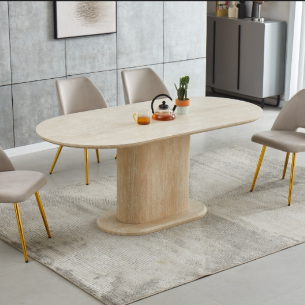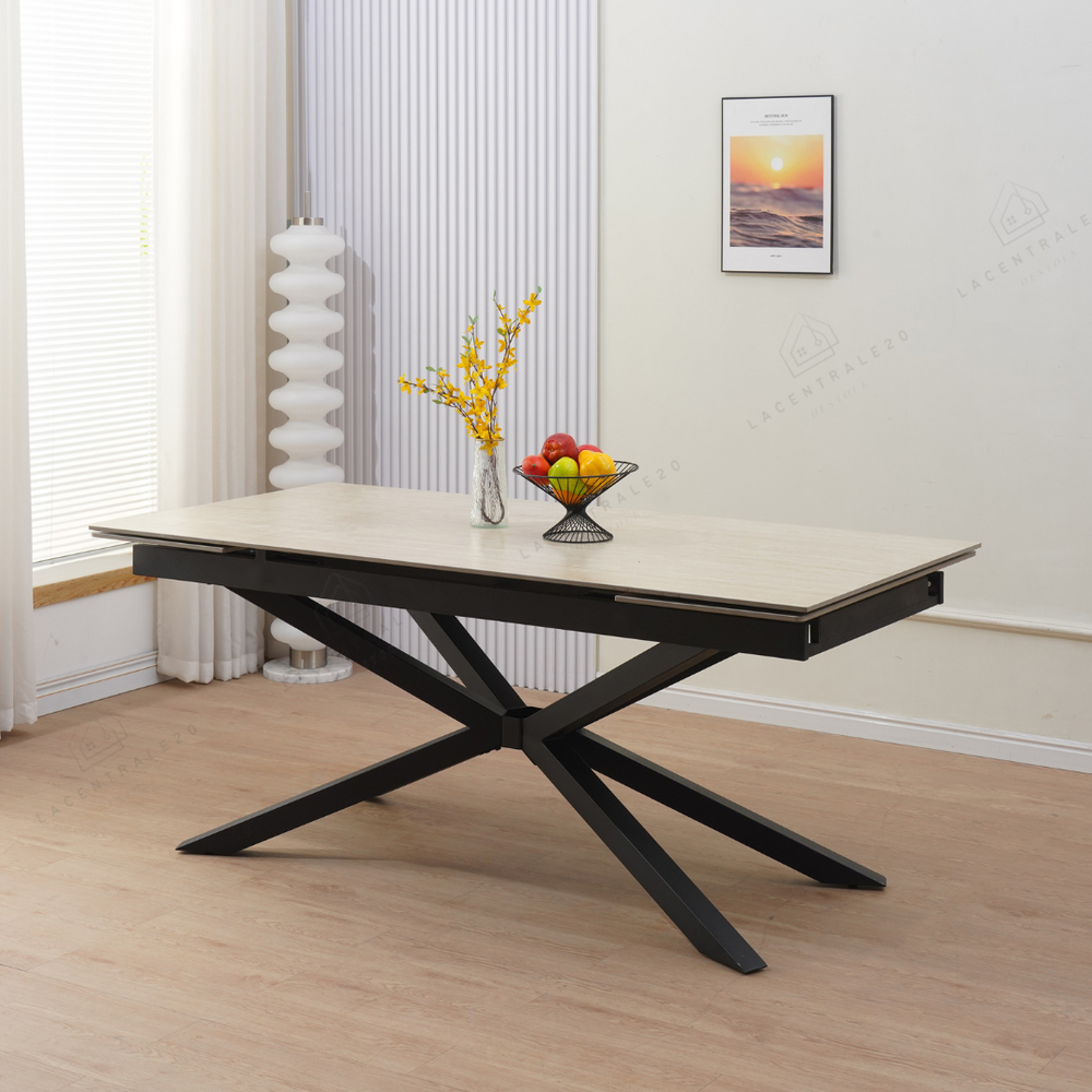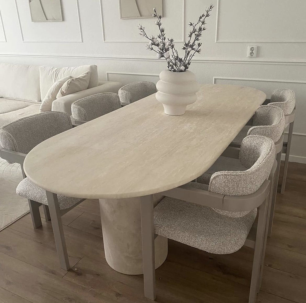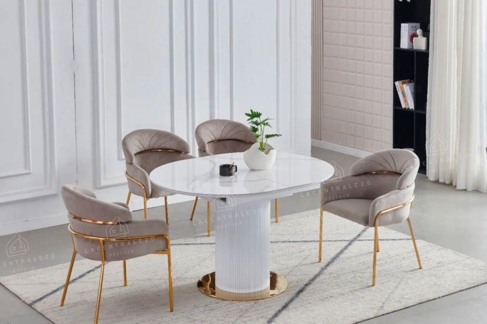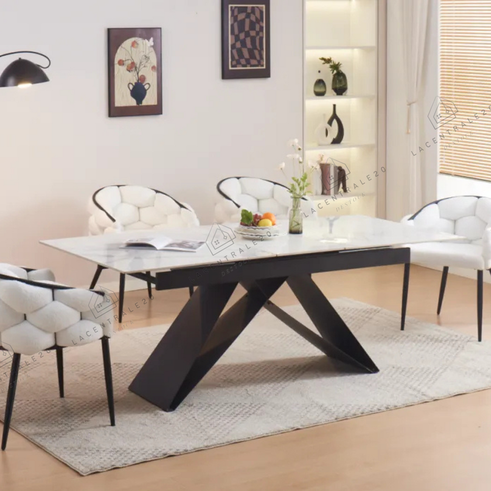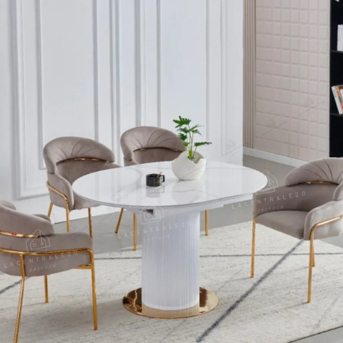 La table Sahara allie design travertin et fonctionnalité. Compacte au quotidien, généreuse quand vous recevez.