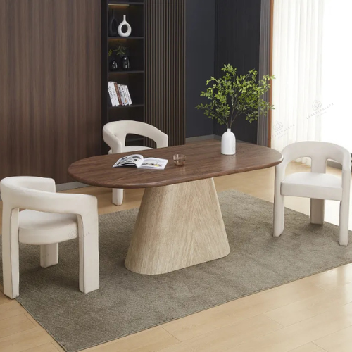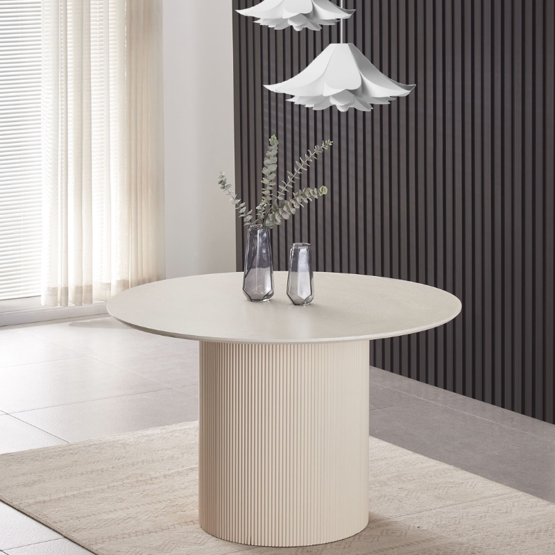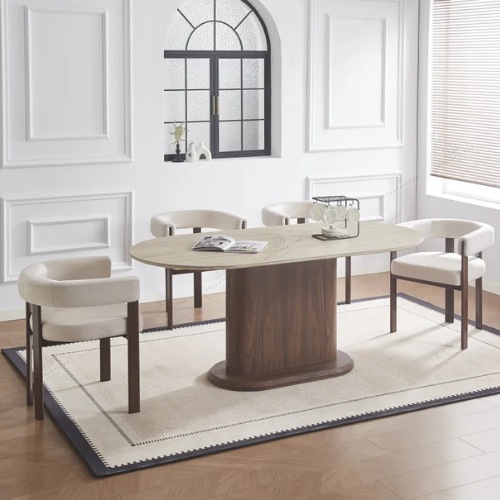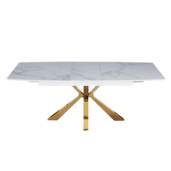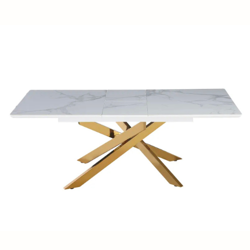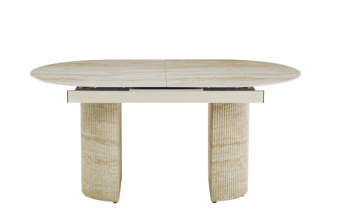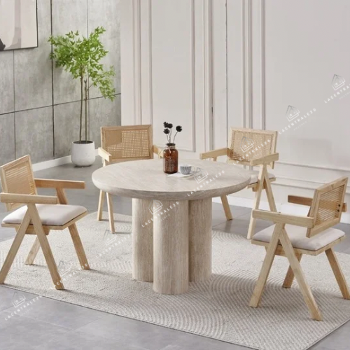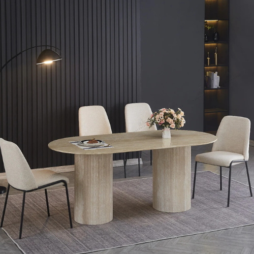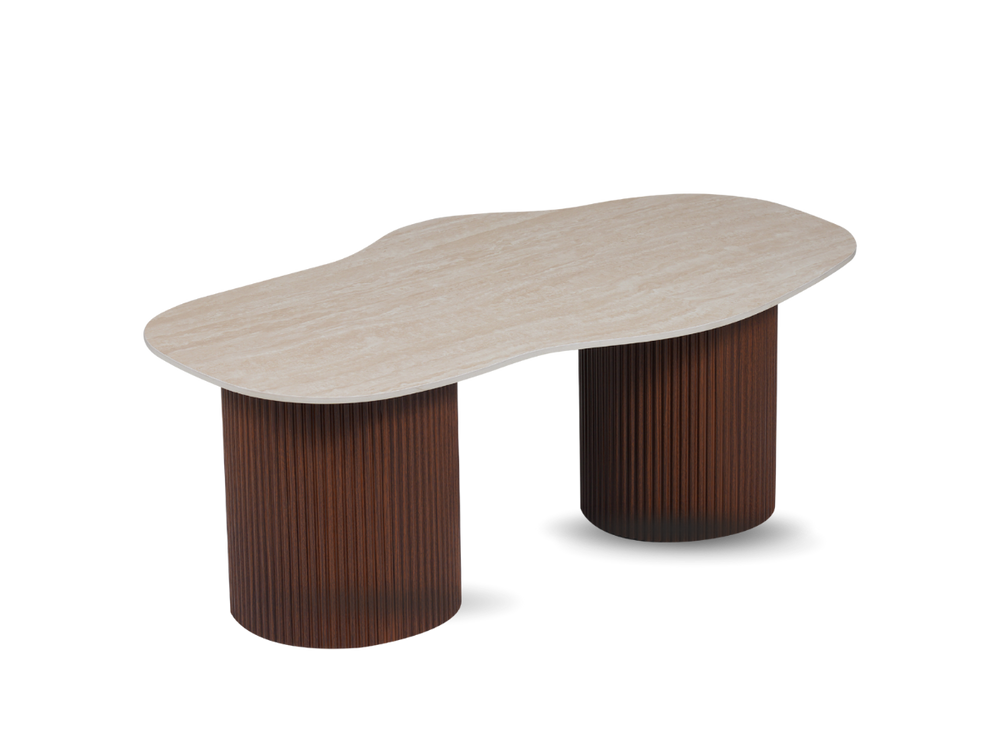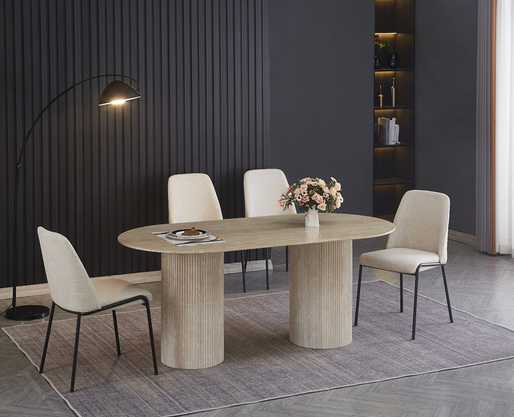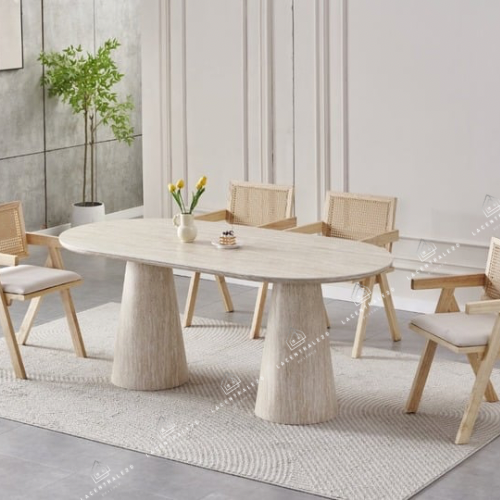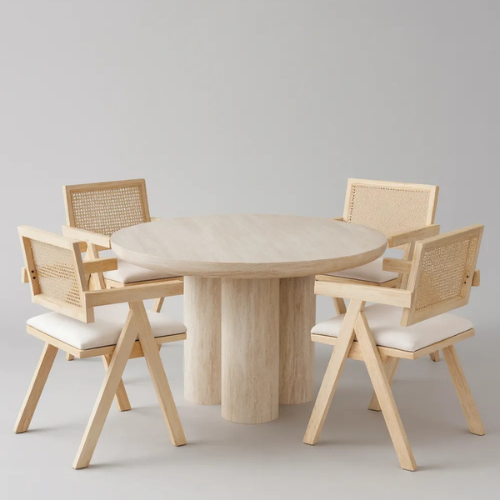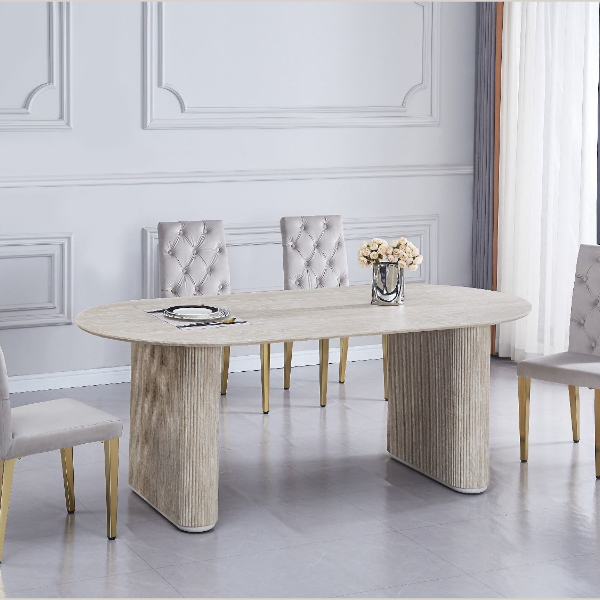 La table Sahara allie design travertin et fonctionnalité. Compacte au quotidien, généreuse quand vous recevez.