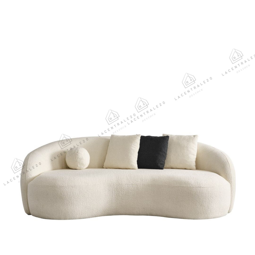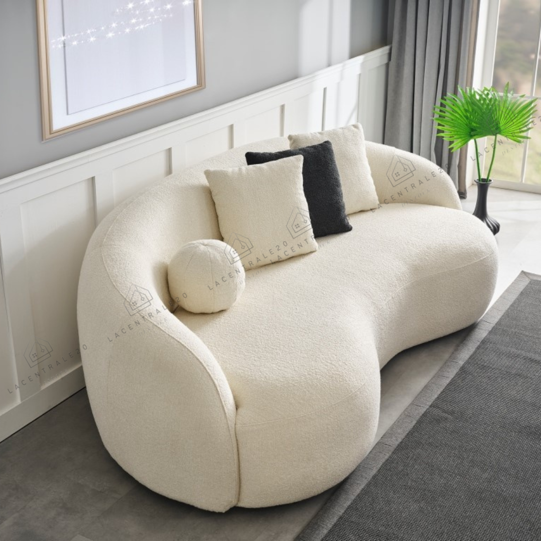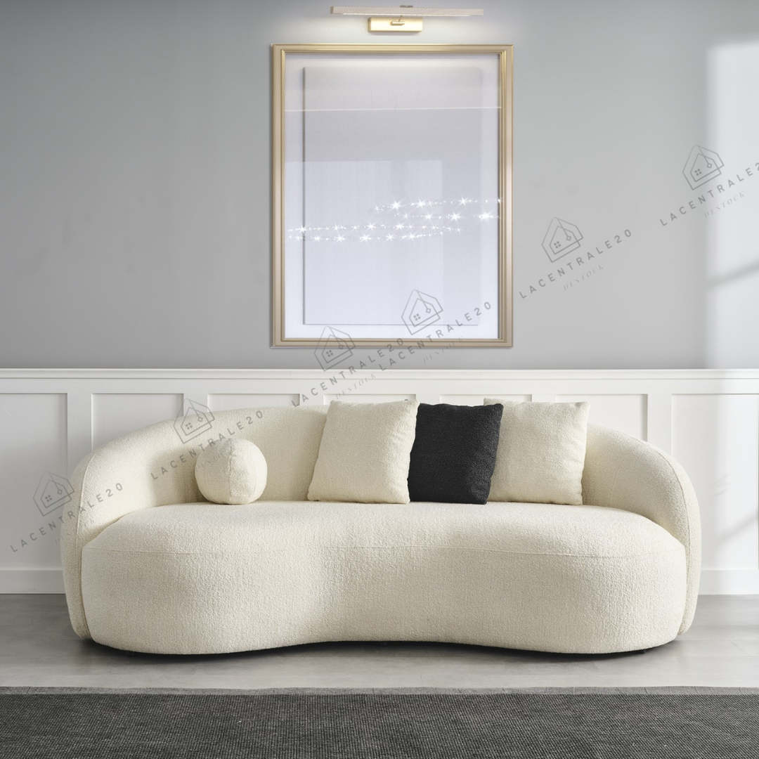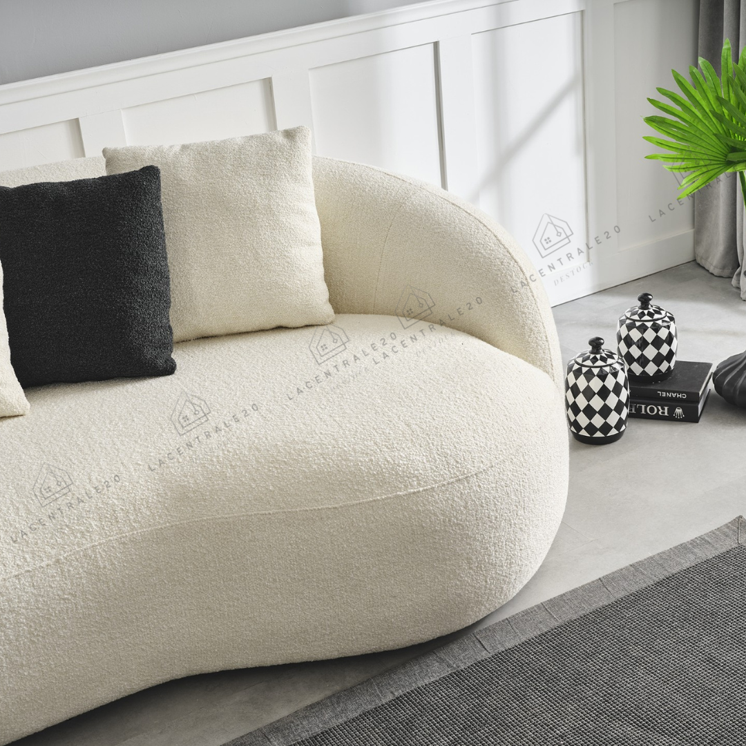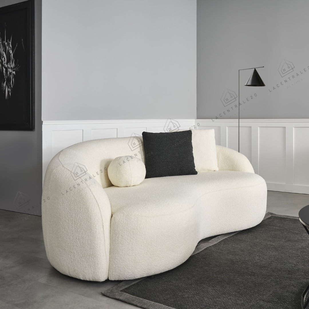 Le canapé Lisbon se distingue par son design arrondi et son allure moderne. Son revêtement en laine bouclée ou velours blanc apporte douceur, élégance et luminosité à votre intérieur. Avec son assise confortable et son style épuré, il convient parfaitement aux salons modernes, cosy ou minimalistes.