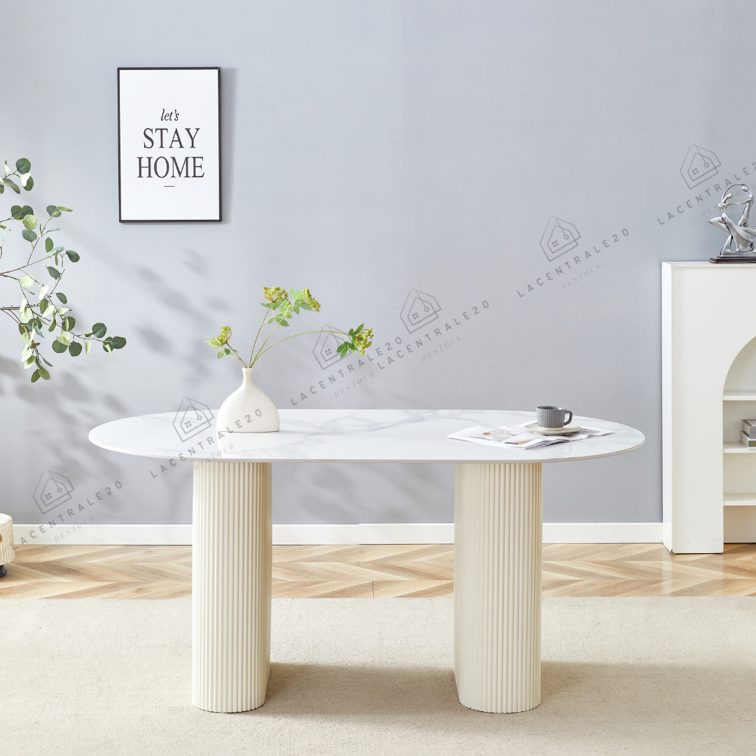 Profitez d'un dîner stylé avec la table repas Rox . Son plateau en céramique offre un effet travertin ou marbre blanc pour une touche élégante. Une base solide assure une stabilité durable. Ajoutez une touche de luxe à votre salle à manger avec cette table repas.