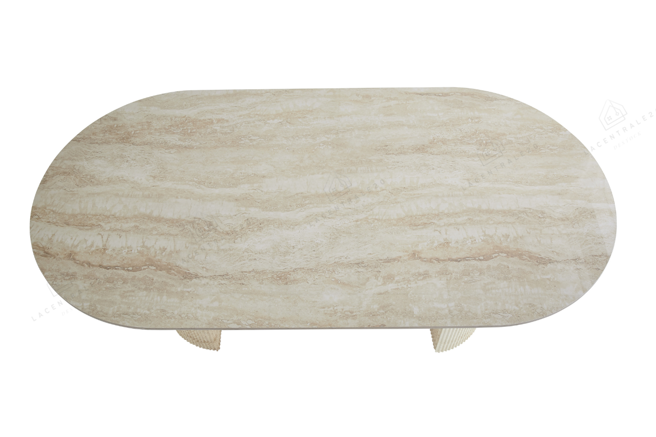 Son plateau en céramique effet travertin brillant reflète la lumière avec subtilité, tandis que ses pieds cylindriques texturés effet pierre ajoutent du caractère à l’ensemble.