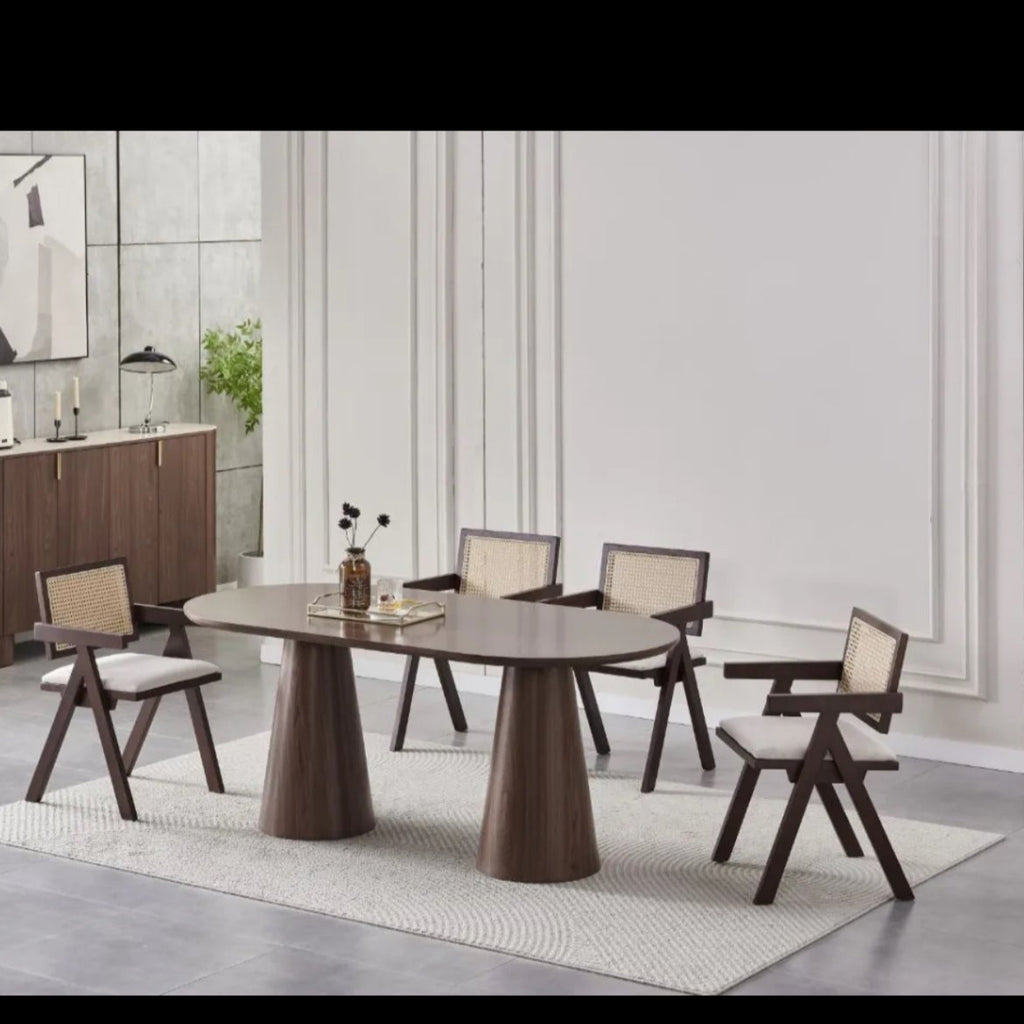 Apportez une touche de chaleur contemporaine à votre intérieur avec la table à manger Iconic. Son plateau ovale en effet travertin clair, aux finitions minérales naturelles, repose sur deux pieds coniques en bois finition noyer foncé qui lui confèrent une allure sculpturale et raffinée.
