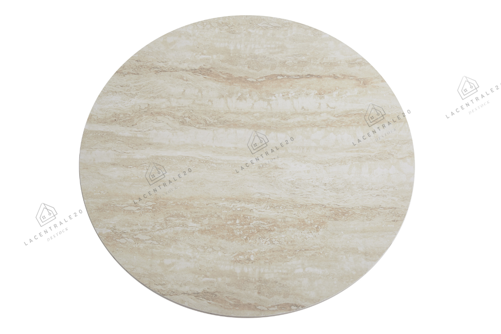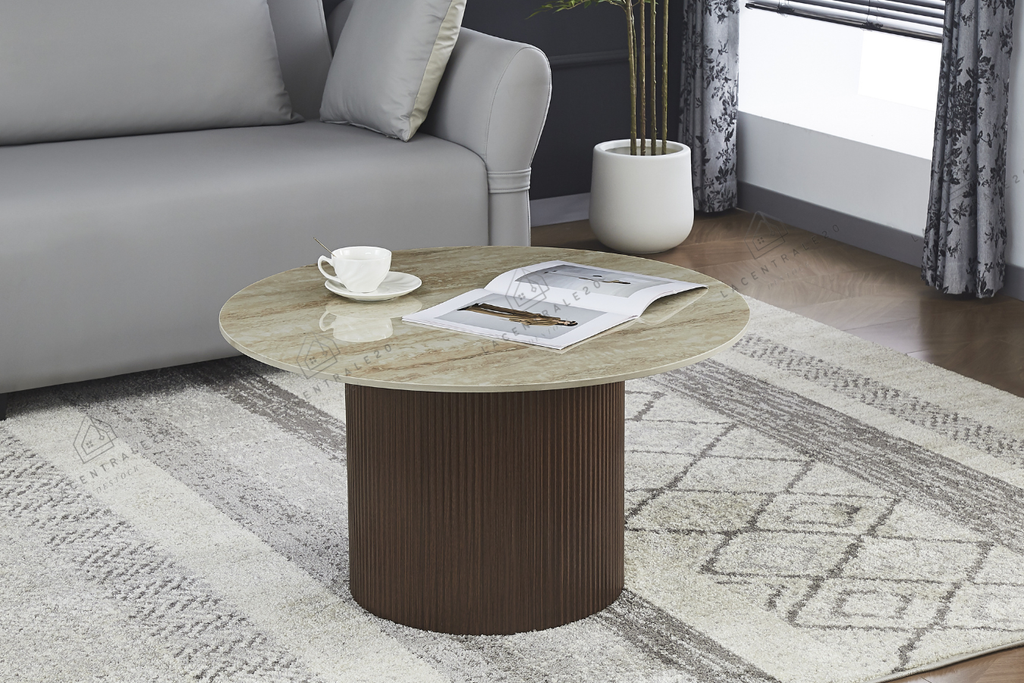 Son plateau rond en céramique effet travertin brillant illumine le salon, tandis que son pied cylindrique rainuré effet noyer apporte une touche naturelle et raffinée.